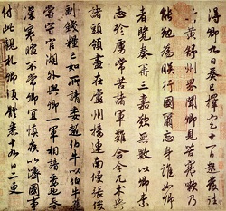 赵构(1107-1187)宋高宗,字德基,宋徽宗赵佶第九子,钦宗赵桓弟。15岁封为康王,北宋靖康元年(1126)十一月,金兵攻陷宋都汴京(今河南开封),徽、钦二帝做了俘虏,北宋灭。其时,康王赵构正受命为河北兵马大元帅,拥兵万人在外。宋旧将臣便拥戴他为皇帝。翌年(1127)五月初一日,21岁的康王构在应天府(河南商丘,当时称南京)正式即帝位,改元建炎,史称南宋,构即为高宗。为南宋第一个皇帝。 赵构即位初年,尚能起用一些抗战派将领。但他不是力图北进收复中原,而是一心想讨好金人,南迁后建都临安(今浙江杭州)。他为政是“直把杭州作汴州”,只知道向金纳贡称臣,苟且偷安,在位三十六年,成偏安之局。赵构政治上昏庸无能,然精于书法,善真、行、草书,笔法洒脱婉丽,自然流畅,颇得晋入神韵,明代陶宗仪《书史会要》称:“高宗善真、行、草书,天纵其能,无不造妙。”其书法影响和左右了南末书坛,后人多效法其书迹。赵构少即醉心书道,陆游曾说:“思陵妙悟八法, 留神古雅,访求法书名画,不遗余力。清闲之燕,展玩摹拓不少怠。”他曾自谓:“余自魏、晋以来以至六朝笔法,无不临摹,众体备于笔下,意简犹存取舍,至若禊帖,测之益深,拟之益严,以至成诵。”他整理收集宣和内府因战乱而散失的占代法帖名画,身体力行地提倡大众研习书法。他认为:“士人于字法,若少加临池之勤,则点画便有位置.无面墙信手之愧。”他自己善学<兰亭序),便赠之与王子和朝中大臣,又让宋孝宗学书。一时间,以高宗为中心,南宋几乎掀起了一个学书高潮。马宗霍在《书林藻鉴)中说:“高宗初学黄字.天下翕然学黄字,后作米字,天下翕然学米字,最后作孙过庭字,而孙字又盛……盖一艺之微,苟倡之自上,其风靡有如此者。”这种以权贵的好恶而人为左右书体盛衰,影响了南宋书法的发展,但宋高宗对南宋书坛的贡献还是不能抹杀的。著有《翰墨志》一卷,传世墨迹有《草书洛神赋》、《正草千字文》及《光明塔碑》等。传本《顾恺之女史箴图题字》、《褚遂良倪宽赞》 等亦有指为构所书者。